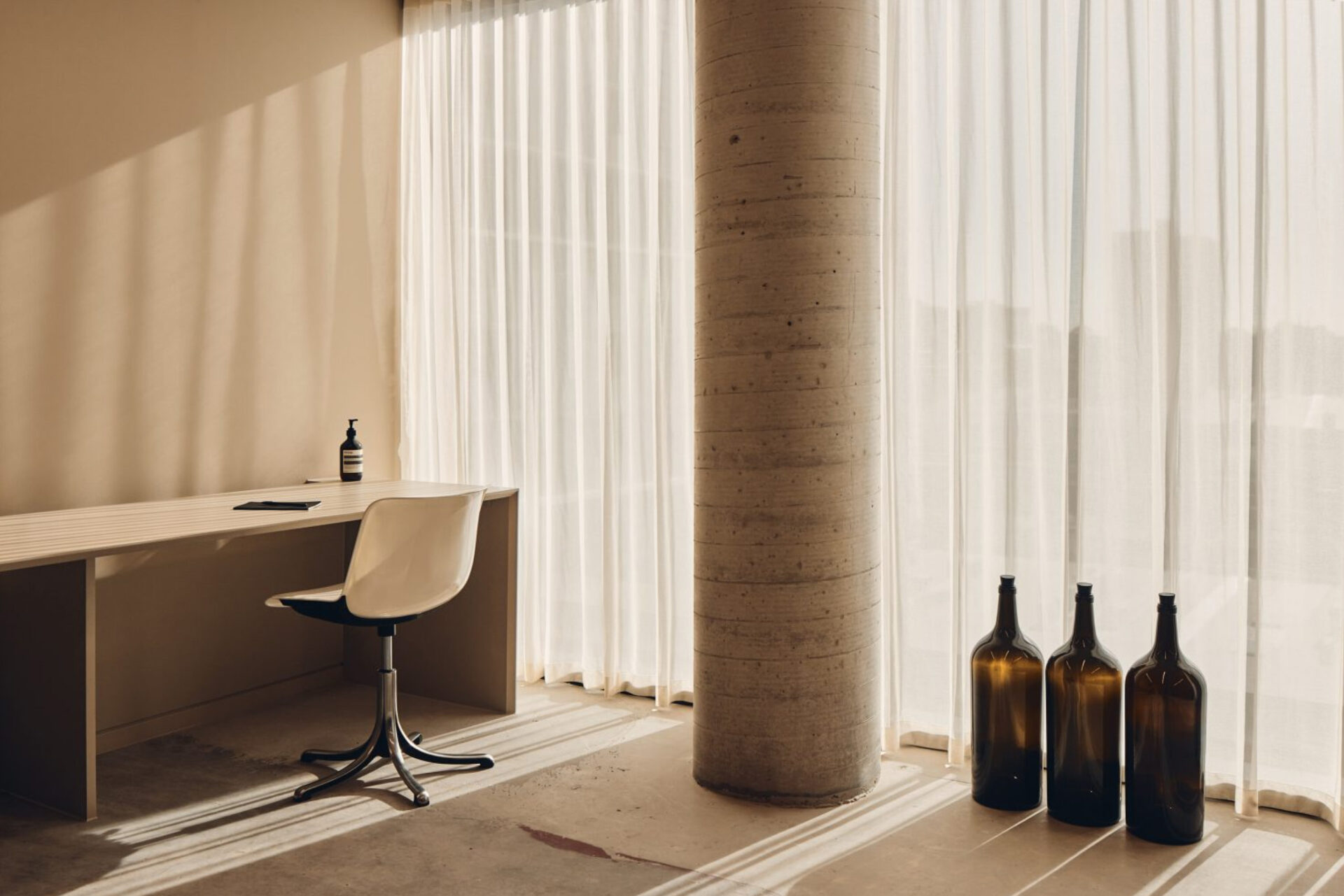 Aesop ritual and culture is the heart of their business and the values they hold ring true in the experience of their workplace. Melbourne is regarded as the home of Aesop, particularly in Collingwood amidst it’s concrete jungle. From a series of warehouses, Aesop moved into a commercial building but wanted to retain the heritage of simplicity, encouraging our philosophy of “pare it back to the essence but don’t forget the poetry” (Leonard Koren). This led to a place that is beautifully balanced between rich timbers, raw concrete, linen curtains and stainless steel, detailing and gestures that are uncluttered and a place that proves to be honest, low-impact, functional and elegant.