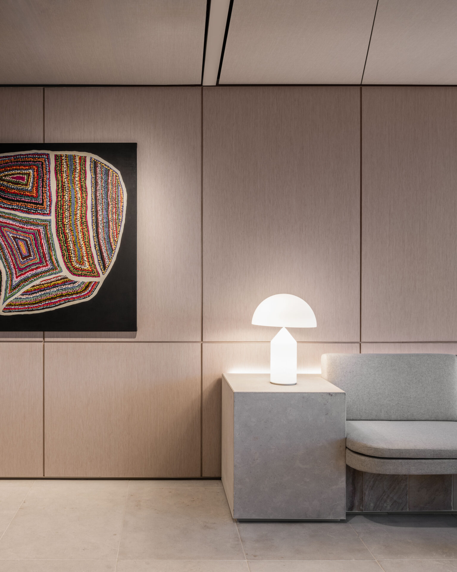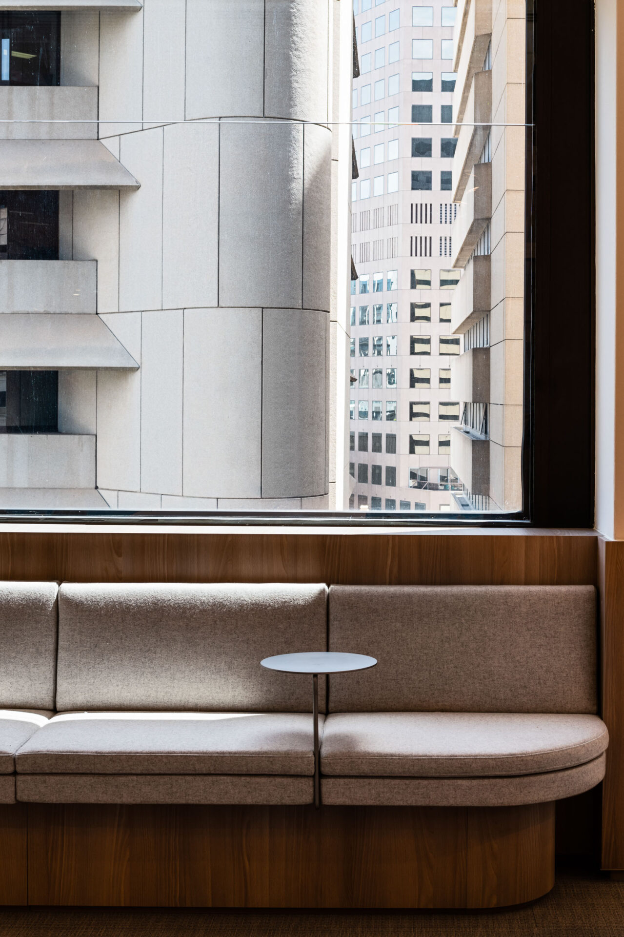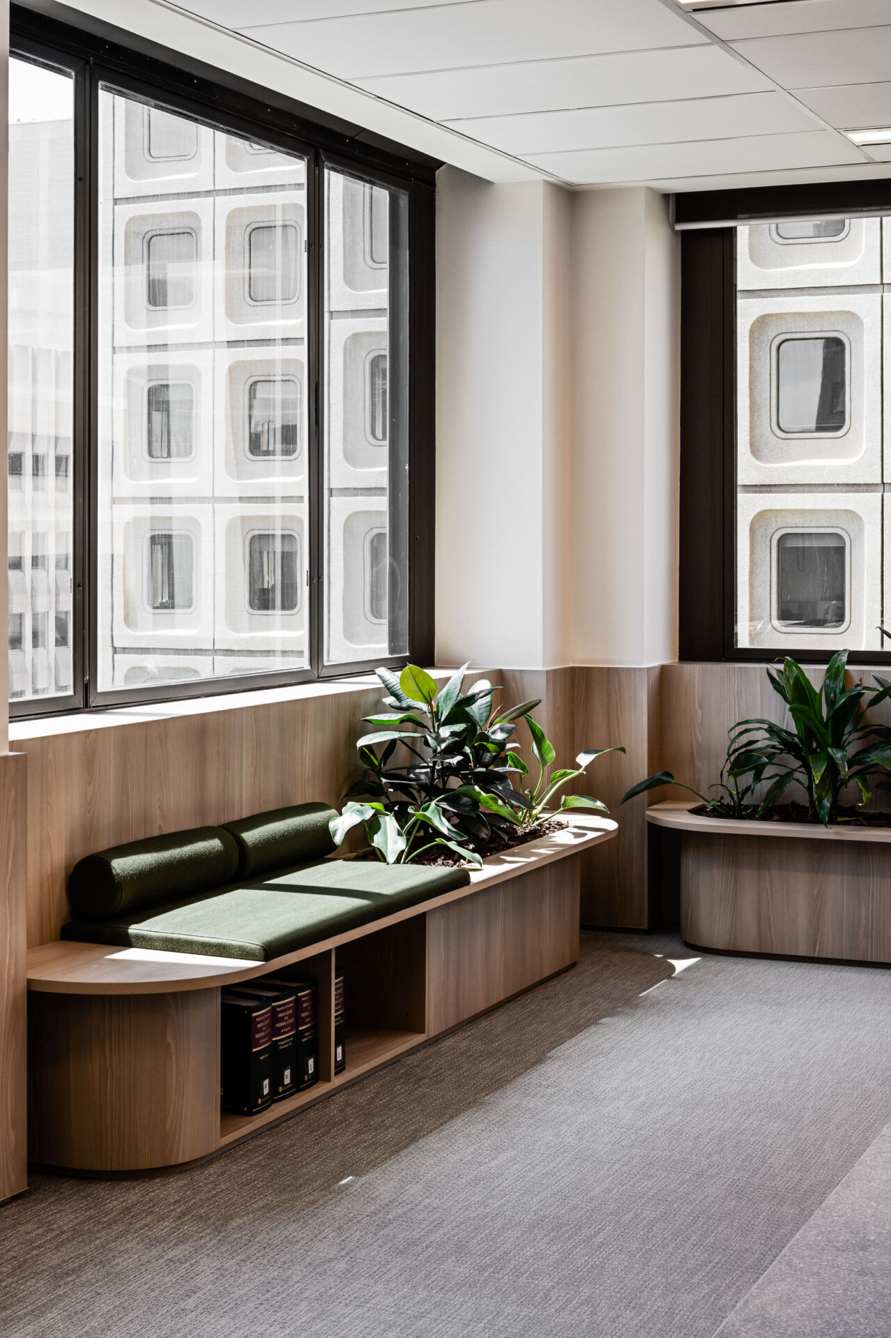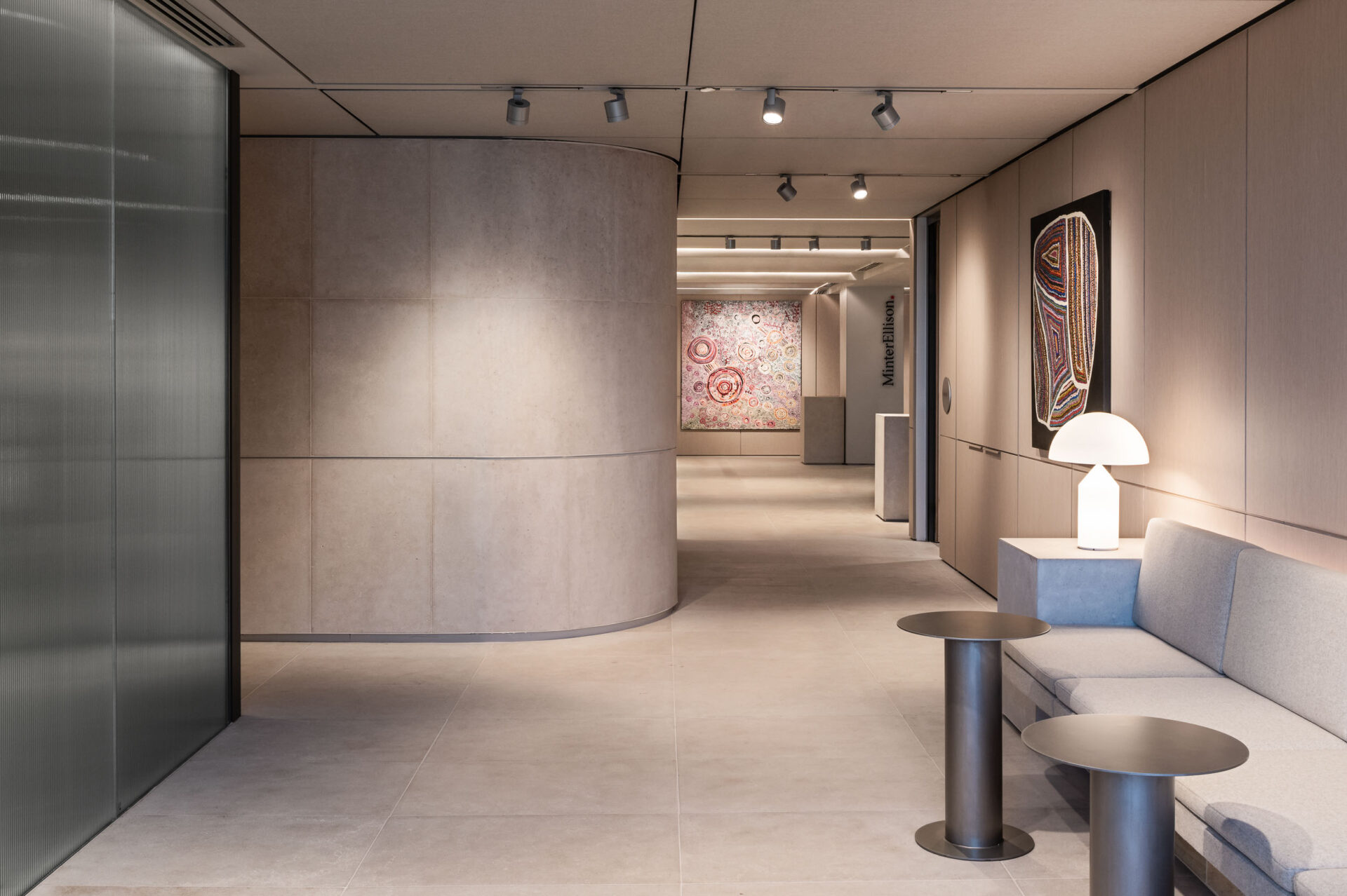 MinterEllison Adelaide sits in the heart of the Adelaide CBD, amidst an array of 1970’s brutalist buildings with their concrete palette and care for detailing. With this rich context, the workplace refurbishment introduced an internal stair across three levels, pocket “garden” collaboration spaces and a centralised breakout with a workplace planning philosophy to enable agile working. The project sources Australian stone, timbers and fabrics including refurbishing existing furniture. The result is a calm, contemporary workplace that sits quietly in it’s surrounds.